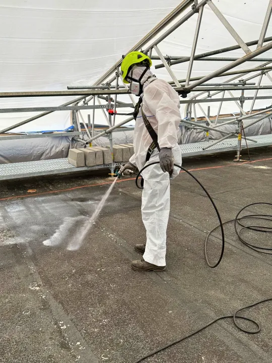 Likvidácia azbestu prebieha v kontrolovaných pásmach s podtlakovým systémom, HEPA filtráciou a presne definovaným technologickým postupom. Materiál je enkapsulovaný, bezpečne demontovaný, zabalený a odvezený na autorizovanú skládku.